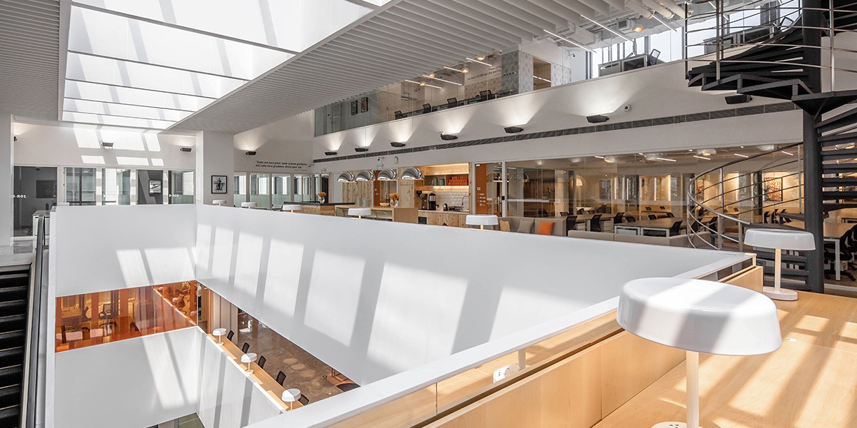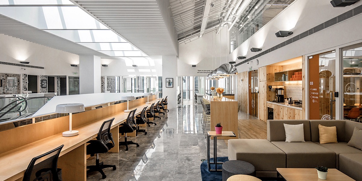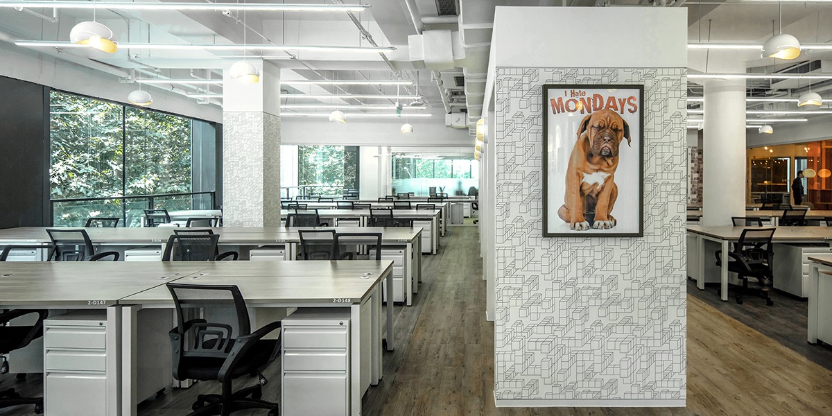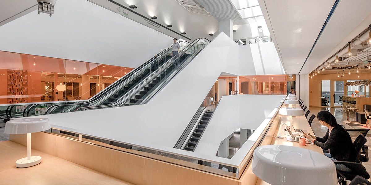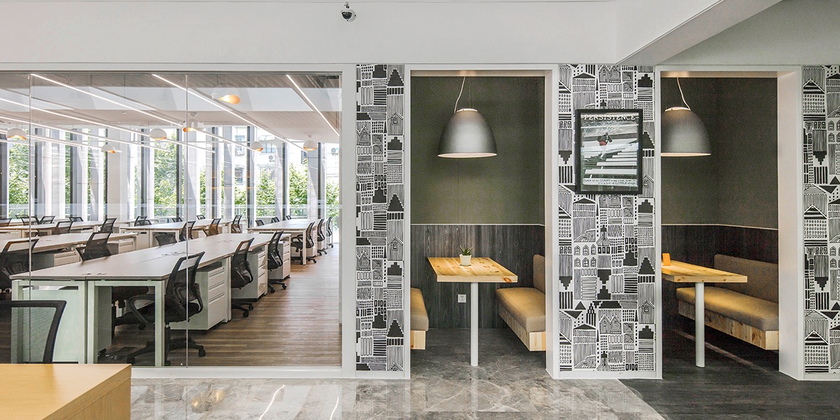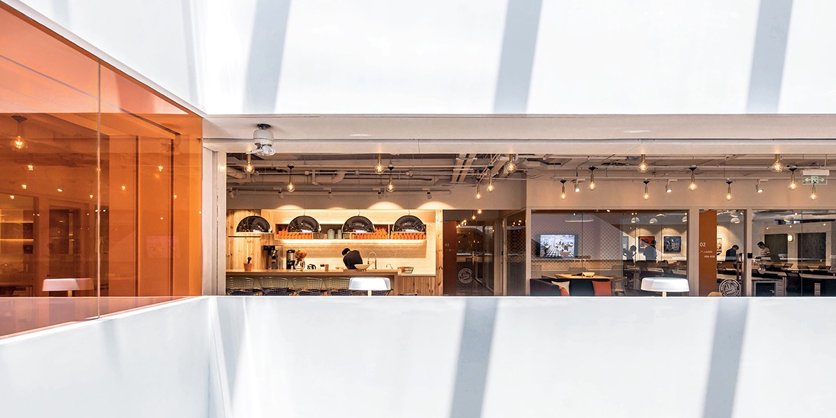 This new 3Q is located within Fuxing Plaza (FXP), a bustling retail space in downtown Shanghai. It is the latest 3Q addition in FXP, which, along with its location, presented a design challenge to the anySCALE team; how to be part of the 3Q brand and still unique in its design. An atrium overlooking the mall’s public spaces occupies the central space. Full-height, orange-tinted glass was therefore installed in certain areas to unify the 3Q theme, visible from the ground floor. While the previous 3Qs in FXP were designed with a strong colour range with high contrasts, building E’s 3Q design went for a milder approach with a focus on warm colours. As a corner building the natural light is plentiful and the greenery from the outside trees is pulled into the spaces, creating a natural compliment to the orange and yellow tones. This 3Q also introduced a new type of built-in furniture; long “public space” working tables overlooking the atrium.