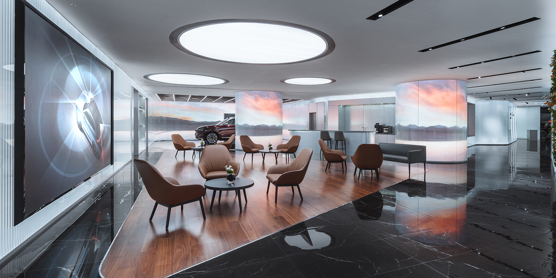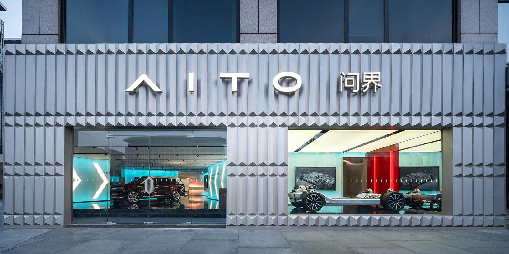 anySCALE was commissioned to create AITO’s first flagship store in Beijing, located in one of the city’s most prestigious malls just steps from the Forbidden City. The project establishes a design benchmark for AITO’s future retail presence in China and beyond, distinguished by two signature elements: a dynamic three-dimensional façade derived from the brand’s logo, and an immersive elevated digital wall that flows through the irregular interior, seamlessly connecting the street entrance with the mall.