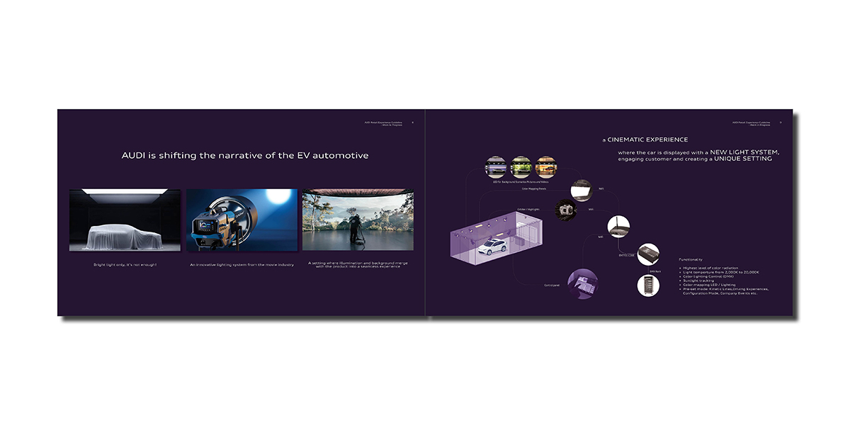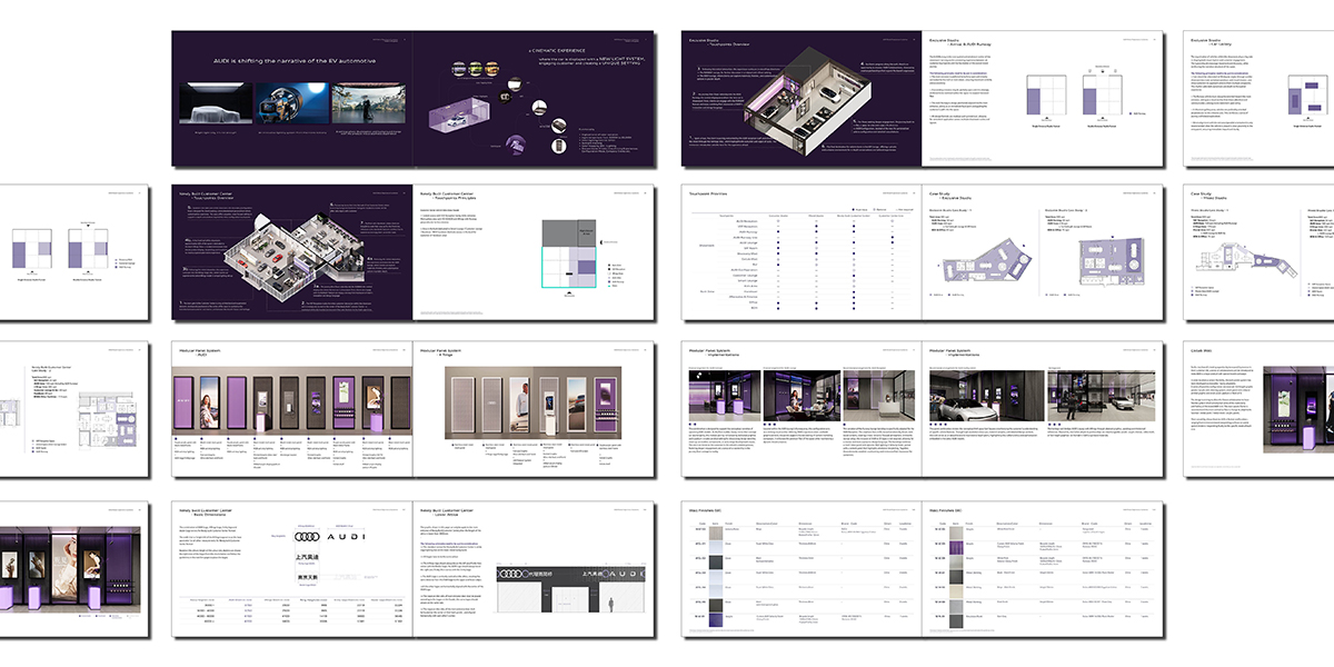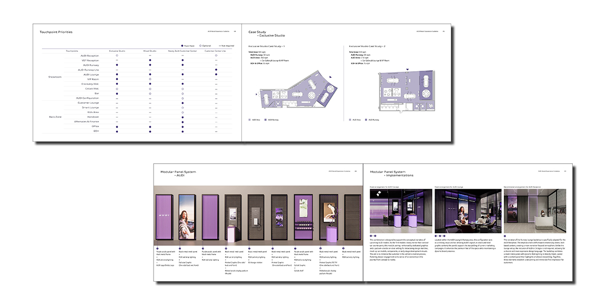 The spatial concept centers on the AUDI Runway—a core installation combining stage presence with digital immersion. The design guideline translates this “central stage” into executable standards by defining proportions, lighting logic, and digital interface integration. As a result, the AUDI Runway becomes a scalable, adaptable core module rather than a one-time installation.